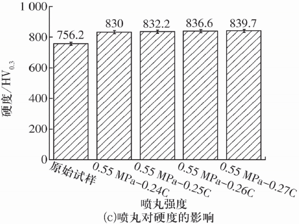經(jīng)不同噴丸強(qiáng)度處理后8Cr4Mo4V鋼表面殘余應(yīng)力如圖14a所示,殘余壓應(yīng)力對(duì)噴丸強(qiáng)度不敏感。鋼丸直徑對(duì)材料殘余應(yīng)力的影響如圖14b所示,增加鋼丸直徑可在8Cr4Mo4V鋼表面引入更高的殘余壓應(yīng)力。8Cr4Mo4V鋼在不同噴丸強(qiáng)度下的表面顯微硬度如圖14c所示,與未處理試樣相比,噴丸后材料顯微硬度呈增加趨勢,最大增幅為11.1%。