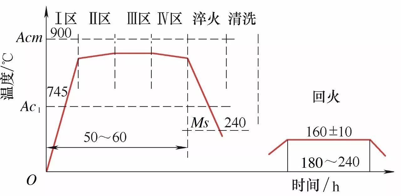 內(nèi)外圈使用保護氣氛連續(xù)爐淬火,為減小變形,使用KR468G專用軸承淬火油并調(diào)整加熱溫度時間、輸送帶運行速度等參數(shù)或也可用鹽浴進行馬氏體分級淬火,工藝曲線如圖10所示,淬火后硬度達63~64.5 HRC,經(jīng)180±10 ℃回火后硬度61~63HRC,檢得套圈的錐度0.05mm左右,圓柱度≤0.15 mm。