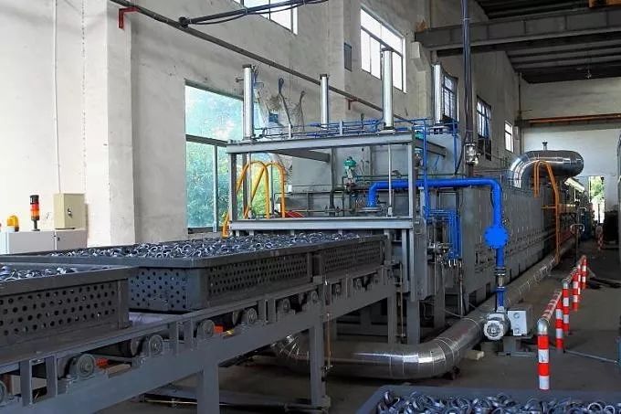 淬回火設備通常也使用保護氣氛爐型如鑄鏈爐、網(wǎng)帶爐或推桿爐,如圖9b所示,生產(chǎn)效率高、能耗低,常見的國內(nèi)生產(chǎn)廠家有江蘇豐東、北方工業(yè)、杭州金舟等。