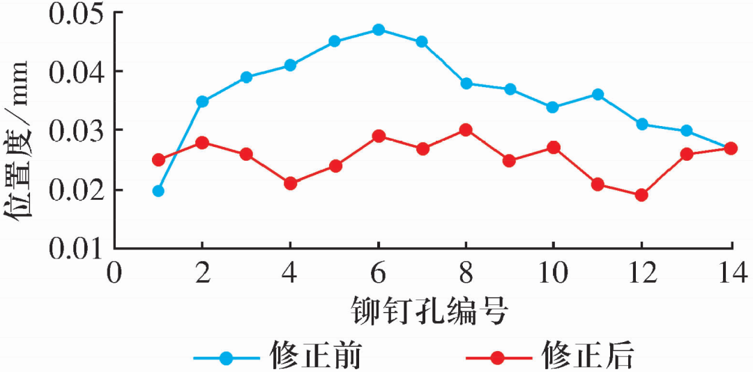 采用極角偏差最大極差的1/2進(jìn)行修正后的測量結(jié)果見表2,由表可知孔位置度在合格范圍內(nèi),且修正后的位置度分布均勻(圖3),符合實(shí)際要求。