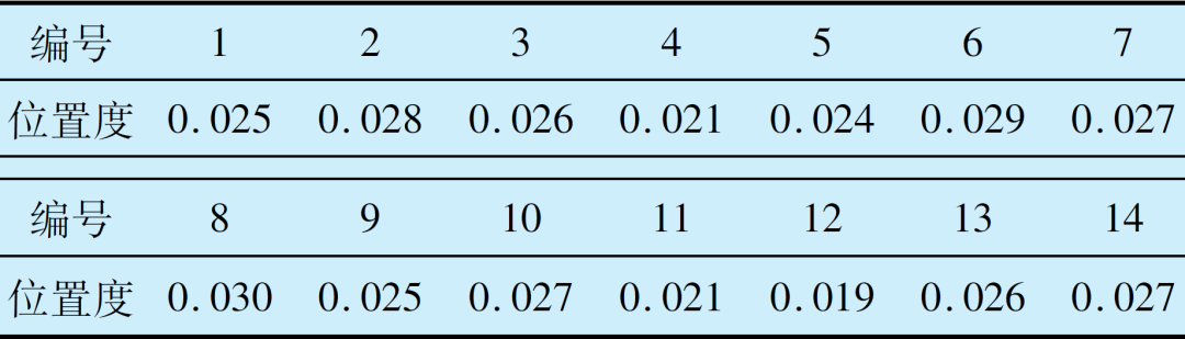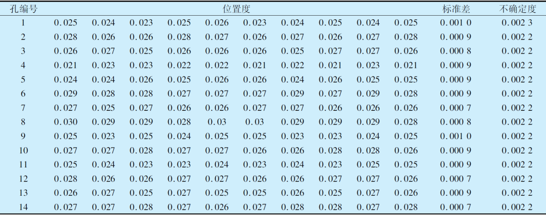為驗(yàn)證該方法的可靠性,對(duì)該型號(hào)軸承半保持架孔位置度重復(fù)測量10次,并計(jì)算測量數(shù)據(jù)的平均值及標(biāo)準(zhǔn)差,結(jié)果見表3:14個(gè)孔位置度測值的標(biāo)準(zhǔn)差最大為0.001 mm,離散性較低,測量數(shù)值可靠;測值不確定度不超過0.003 0 mm,同樣說明該方法的測值準(zhǔn)確可靠。