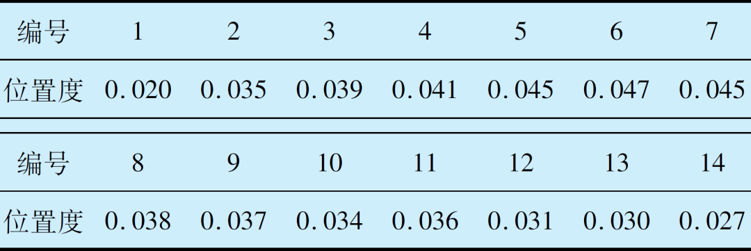 某型軸承半保持架鉚釘孔孔徑為0.7 mm, 14等分,中心徑公稱尺寸為(41.9±0.04)mm,位置度要求為0.03 mm。由未修正的測量結(jié)果(表1)可知選取任意一個(gè)孔作為基準(zhǔn)進(jìn)行評(píng)價(jià),其余孔呈一定規(guī)律性變化,基準(zhǔn)孔位置度較小,依次增大后變小(圖3)。