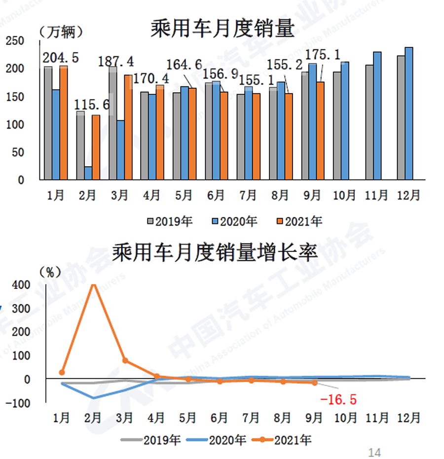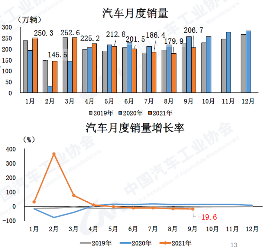 9月,汽車產(chǎn)銷分別達(dá)到207.7萬(wàn)輛和206.7萬(wàn)輛,環(huán)比增長(zhǎng)20.4%和14.9%,同比下降17.9%和19.6%。