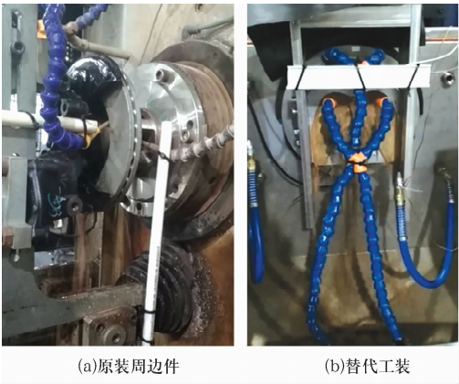 5)工裝條件。德系(大眾、奧迪、寶馬、奔馳)和部分日系(馬自達)車企在密封試驗中引入了輪轂軸承的原裝周邊零件(制動盤、擋泥板、驅(qū)動軸、轉(zhuǎn)向節(jié)或車輪支架等)以最大程度的還原輪轂軸承的整車安裝條件,這種條件的引入使得泥漿應用噴射中不是直接侵入密封唇口接觸區(qū)域,而是通過其他周邊零件導流進入密封唇口的接觸區(qū),降低了密封失效概率。而美系(通用、福特)和其他日系車企(日產(chǎn)、豐田等)仍采用替代工裝執(zhí)行密封試驗。2種工裝條件的對比如圖7所示。