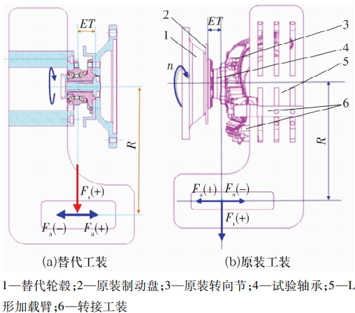 2)試驗載荷方向的標定。在20世紀90年代前,汽車輪轂軸承行業(yè)未開展臺架上加載載荷方向?qū)υ囼瀴勖绊懙纳钊胙芯?,基本為機械式地照搬借用。實際上,耐久性試驗是對車輪受載的模擬,試驗臺架上載荷方向的標定應與整車坐標系中的方向定義保持一致。以圖3所示原理圖為例:當采用旋轉(zhuǎn)件加載執(zhí)行試驗時,與整車條件一致,其加載方向也應與車輪受力方向一致;而采用非旋轉(zhuǎn)件加載時,根據(jù)作用力與反作用力的關系,其加載方向應與車輪受力方向相反。