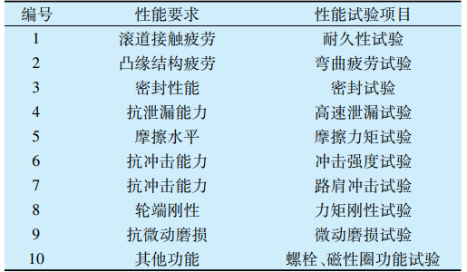 乘用車輪轂軸承在整車上發(fā)揮著承載與傳動這2大功能,對功能可靠性的滿足又衍生出相應的性能要求:長壽命、低摩擦、高強度、高剛度、抗沖擊、耐微動、抗泄漏、抗泥水等。以典型的第三代輪轂軸承單元為例,輪轂軸承的性能要求與各基礎件要求之間的映射關系如圖1所示。決定輪轂軸承每個性能的因素多且復雜,全面評價輪轂軸承性能需要涉及到多種性能試驗,可歸納為10項(表1)。