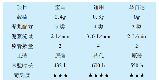 顯然,密封試驗除了與以上試驗條件有關外,還與試驗時長密切相關,典型主機客戶的密封試驗條件及其評價見表2,其中星號越多表示試驗越苛刻。由于密封試驗的影響因素較多,為保證密封試驗的準確性及可靠性,試驗中應重點關注流量、泥漿濃度和噴管位置的均勻性,在密封試驗系統(tǒng)的開發(fā)中應充分考慮這3點。