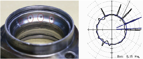 微動磨損而引起的輪轂軸承滾道磨損形態(tài)及圓度儀檢測結(jié)果如圖13所示,磨損表現(xiàn)出2個特征:等間距磨斑;磨斑呈現(xiàn)棕黃色高溫跡象。