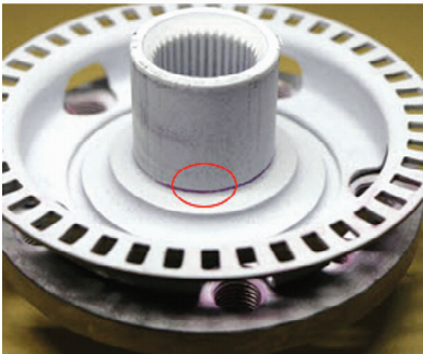 為解決以上2類彎曲疲勞試驗方法的矛盾性問題,浙江萬向精工有限公司于2016年開始研制第3類彎曲疲勞試驗方法并逐步應用于實際產(chǎn)品的開發(fā),其核心是改進第1類彎曲疲勞試驗方法,通過研制特種工裝摒棄輪轂軸承的外圈、內(nèi)圈與鋼球等零件,僅在試驗臺上對凸緣進行疲勞試驗。采用第3類彎曲疲勞試驗方法的某凸緣試驗結(jié)果如圖6所示,在軸頸部探傷出裂紋,試驗效果十分理想。