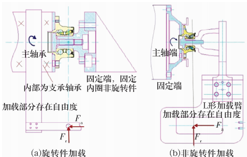 1)加載模式的選定。行業(yè)內(nèi)存在旋轉(zhuǎn)件加載、非旋轉(zhuǎn)件加載這2種加載模式,從原理圖(圖3)中可看出2種加載模式在載荷傳遞上存在顯著差異:旋轉(zhuǎn)件載荷傳遞路徑為加載臂、中間支承軸承、旋轉(zhuǎn)工裝、試驗軸承的旋轉(zhuǎn)零件、試驗軸承的滾道;非旋轉(zhuǎn)件載荷傳遞路徑為加載臂、非旋轉(zhuǎn)工裝、試驗軸承的非旋轉(zhuǎn)零件、試驗軸承的滾道。旋轉(zhuǎn)件加載模式的載荷傳遞效果對整車車輪上的受力模擬更為真實,由于其引入了一個支承軸承,試驗總成的系統(tǒng)剛性比非旋轉(zhuǎn)件加載的更小,大量對比試驗表明旋轉(zhuǎn)件加載的壽命比非旋轉(zhuǎn)加載的壽命高出近1倍。在2015年之前,大眾與奧迪普遍采用旋轉(zhuǎn)件加載模式評估輪轂軸承滾道接觸疲勞壽命;在2015年后,為加速壽命試驗,更改為非旋轉(zhuǎn)件加載模式。目前,整個行業(yè)普遍采用非旋轉(zhuǎn)件加載模式開展耐久性試驗,但奔馳、馬自達仍采用旋轉(zhuǎn)件加載模式執(zhí)行耐久性試驗。