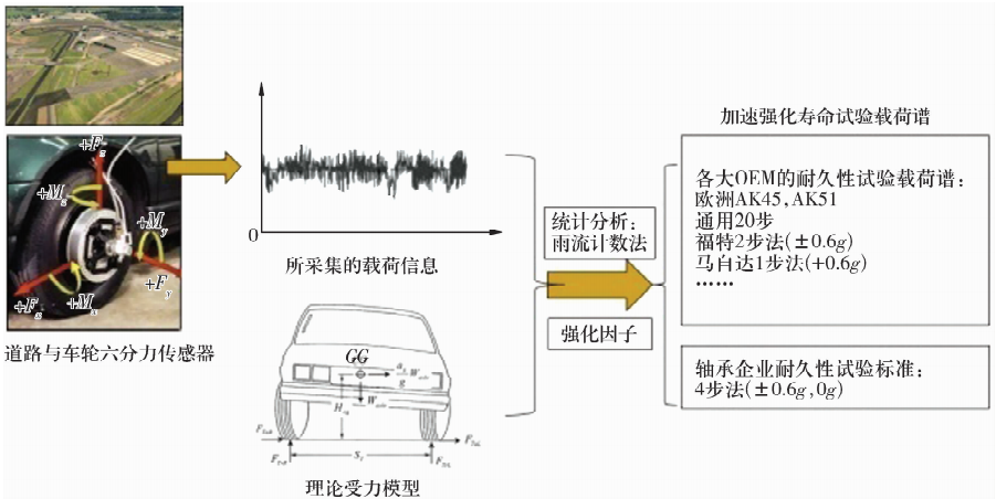 輪轂軸承耐久性試驗的目的是評價軸承的滾道接觸疲勞壽命,當前耐久性試驗方法的研究核心在于編制耐久性試驗載荷譜。耐久性試驗載荷譜的研制流程如圖2所示,其編制依據(jù)為:在實車道路的行駛過程中,采用安裝于輪端的加速度傳感器、六分力傳感器或被標定的應變橋采集車輪承受的載荷,利用雨流計數(shù)法對載荷信息進行分類統(tǒng)計以獲得載荷譜的雛形,借鑒輪轂軸承設計理論中的理論算法對輪端載荷進行估算,綜合這兩者信息并適當引入強化因子從而獲得一個標準的耐久性試驗載荷譜。