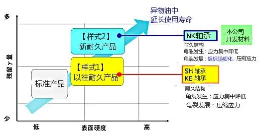 捷太格特一直致力于開(kāi)發(fā)長(zhǎng)壽命軸承,如:KE軸承,SH軸承。隨著無(wú)人自卸車和無(wú)人拖拉機(jī)等自動(dòng)駕駛車輛開(kāi)發(fā)的推進(jìn),自動(dòng)駕駛中軸承受損有可能成為巨大的問(wèn)題。加之減少全壽命周期成本和延長(zhǎng)檢修周期等要求的不斷提高,捷太格特通過(guò)使用新概念的材料和熱處理工藝,開(kāi)發(fā)出了更長(zhǎng)壽的NK軸承。