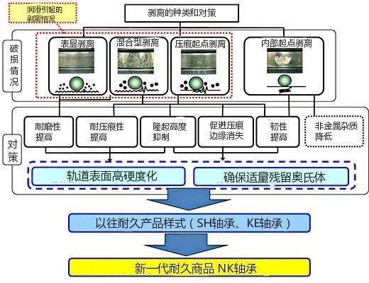 軸承的損傷分為內(nèi)部起點(diǎn)型剝離和表層型剝離,在農(nóng)用機(jī)械和建筑機(jī)械用軸承方面,除了應(yīng)對(duì)內(nèi)部起點(diǎn)型剝離,異物油環(huán)境下針對(duì)以壓痕為起點(diǎn)的表層剝離,提高軸承耐久性成為有效的手段,具體方法如下: