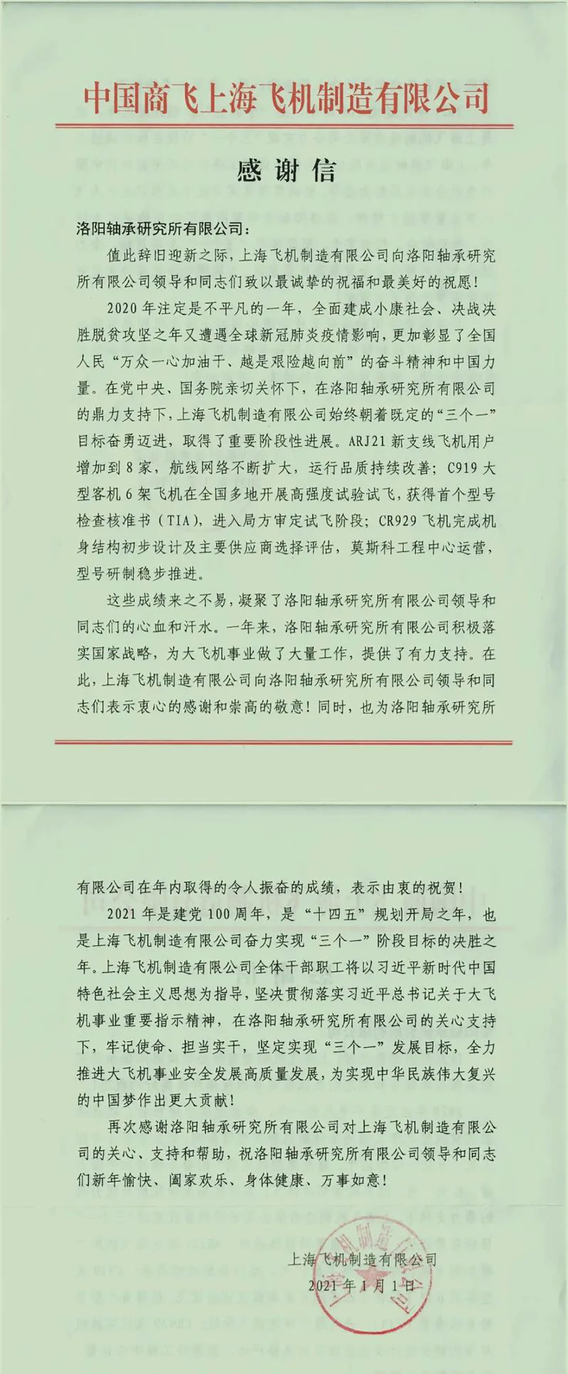 2021年1月,一封來(lái)自上海飛機(jī)制造有限公司(以下簡(jiǎn)稱“上飛”)的感謝信對(duì)軸研所為國(guó)產(chǎn)飛機(jī)事業(yè)的支持表示衷心感謝和崇高敬意,這是對(duì)軸研所科研能力、產(chǎn)品品質(zhì)的充分認(rèn)可!