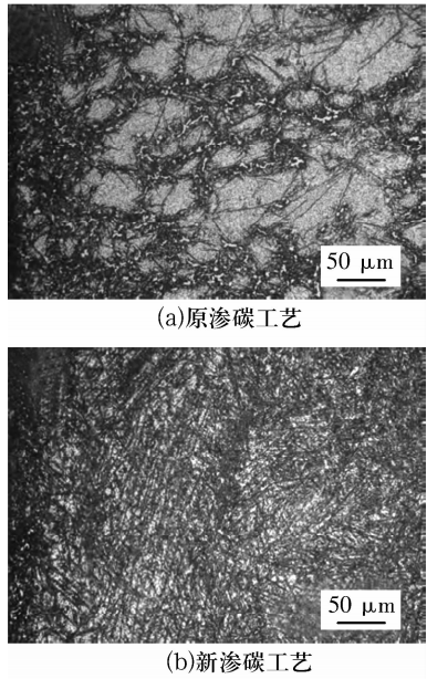 文獻(xiàn)[46]研究表明,高溫滲碳軸承鋼G13Cr4Mo4Ni4V滲碳過程中的碳勢一般控制在0.6%~0.7%,將擴(kuò)散階段的碳勢由0.6%降低到0.5%后,滲碳層碳化物細(xì)小且分布均勻,未出現(xiàn)網(wǎng)狀特征(圖3)。富Mo,Cr 等合金碳化物一旦在晶界形成,會使?jié)B碳吸附過程受阻,降低碳原子擴(kuò)散系數(shù),易造成大量碳原子在表面積聚,將嚴(yán)重影響滲碳軸承鋼的滲碳層深度和表面性能。文獻(xiàn)[48-50]研究發(fā)現(xiàn),在滲碳處理前向爐內(nèi)通入NH3,進(jìn)行預(yù)氮化處理能夠避免形成網(wǎng)狀碳化物,這是因?yàn)轭A(yù)氮化處理使表層中含有一定量的氮原子,氮原子在滲碳過程中會與碳元素及合金元素結(jié)合形成細(xì)小的碳氮化物。文獻(xiàn)[51]嘗試在滲碳軸承鋼初始表面鍍一層Fe-Ni膜,可以起到滲碳緩沖作用,其原理主要是利用碳原子穿越Fe-Ni膜需要一定時間,從而減小強(qiáng)滲階段進(jìn)入到材料表面的碳原子通量,同時減少了沿晶界擴(kuò)散的碳原子數(shù)量,使碳原子沿晶界擴(kuò)散更加有序均勻,減少網(wǎng)狀碳化物的形成。