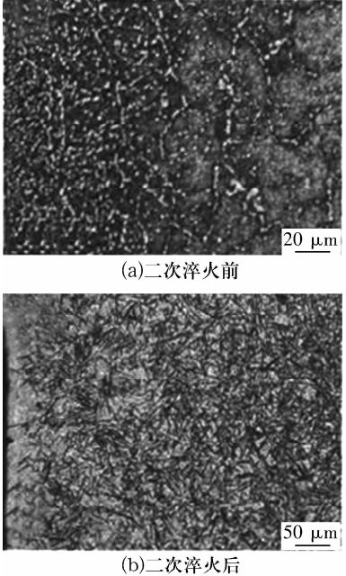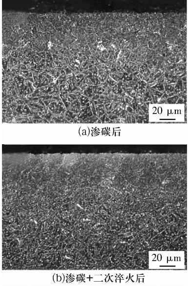 要消除已形成的網(wǎng)狀碳化物,最有效的方法是進(jìn)行二次淬火。對表層中的細(xì)網(wǎng)狀或半連續(xù)稍粗的晶界碳化物,可適當(dāng)提高二次淬火溫度或者延長固溶保溫時間以促進(jìn)大尺寸碳化物充分溶解,之后的冷卻過程中冷速要足夠快,從而抑制晶界碳化物析出。但特別粗大的網(wǎng)狀碳化物無法通過二次淬火徹底消除,如圖4所示,在二次淬回火后仍存在較嚴(yán)重的網(wǎng)狀碳化物,所以在滲碳過程中應(yīng)避免出現(xiàn)粗大網(wǎng)狀碳化物。經(jīng)950 ℃滲碳緩冷后的G13Cr4Mo4Ni4V鋼表面存在斷續(xù)的網(wǎng)狀碳化物,如圖5所示,而在經(jīng)過1 100 ℃真空氣淬后,網(wǎng)狀特征消失,這是因?yàn)楦籑o/Cr碳化物在1 100 ℃的高溫下充分溶解,氣冷過程中碳化物沒有再沿晶界析出。