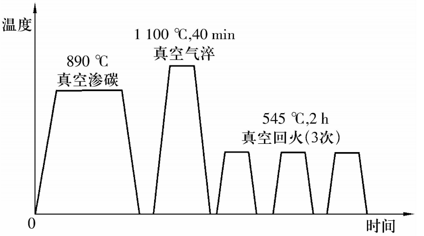 殲–20戰(zhàn)斗機(jī)和C919大飛機(jī)的先后問世代表了我國航空工業(yè)的崛起,而飛機(jī)機(jī)動性的每一次提升主要依靠發(fā)動機(jī)推重比的增加,如今發(fā)動機(jī)主軸dn值已經(jīng)達(dá)到2.4×106 mm·r·min-1,發(fā)動機(jī)主軸軸承的工作溫度逼近300 ℃,且長期承受巨大的沖擊載荷和循環(huán)疲勞應(yīng)力。為適應(yīng)航空軸承更高的性能要求,我國研發(fā)了第2代高溫滲碳軸承鋼G13Cr4Mo4Ni4V(ASTM M50NiL)。根據(jù)YB/T 4106——2000《航空發(fā)動機(jī)用高溫滲碳軸承鋼》規(guī)定,其經(jīng)過滲碳、淬火和回火處理后的表層硬度可達(dá)到62~63 HRC,具有較高的耐磨性和良好的抗疲勞性能,心部板條馬氏體提供了良好的沖擊韌性。圖7所示為G13Cr4Mo4Ni4V鋼常用的滲碳熱處理工藝,真空滲碳時(shí)的溫度一般為890 ℃,然后經(jīng)1 100 ℃淬火,再545 ℃回火處理3次,每次2 h。