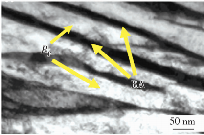 文獻(xiàn)[65]研究了貝氏體等溫淬火對G23Cr2Ni2Si1 Mo鋼滲碳層組織及性能的影響:在200 ℃下等溫8h后,滲碳層獲得了數(shù)量可觀的針狀下貝氏體(圖9a);圖9b中可以清晰地看到,在納米級的貝氏體鐵素體板條之間存在著薄膜狀殘余奧氏體。細(xì)小的貝氏體鐵素體板條使得相界面積大幅度增加,有利于阻礙位錯滑移,抵抗塑性變形,且富碳的薄膜狀殘余奧氏體可以有效阻礙微裂紋擴(kuò)展,因此有利于提高韌性和耐磨性。試驗(yàn)證明,與傳統(tǒng)滲碳淬火相比,等溫淬火鋼的耐磨性提高了58% ,沖擊韌性提高了33.3%。