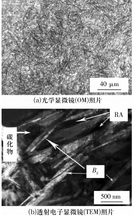 文獻(xiàn)[72]對20CrMnMoAl滲碳軸承鋼在220 ℃下等溫淬火 32 h后幾乎得到了全貝氏體組織(圖10),TEM觀察發(fā)現(xiàn),在貝氏體鐵素體條之間存在著僅十幾納米厚的殘余奧氏體薄膜,由于Al對碳化物的抑制作用,等溫過程中貝氏體鐵素體中的碳原子大量擴(kuò)散至薄膜狀殘余奧氏體中,因此薄膜狀殘余奧氏體的穩(wěn)定性更高,這對軸承尺寸精度的控制有一定益處。