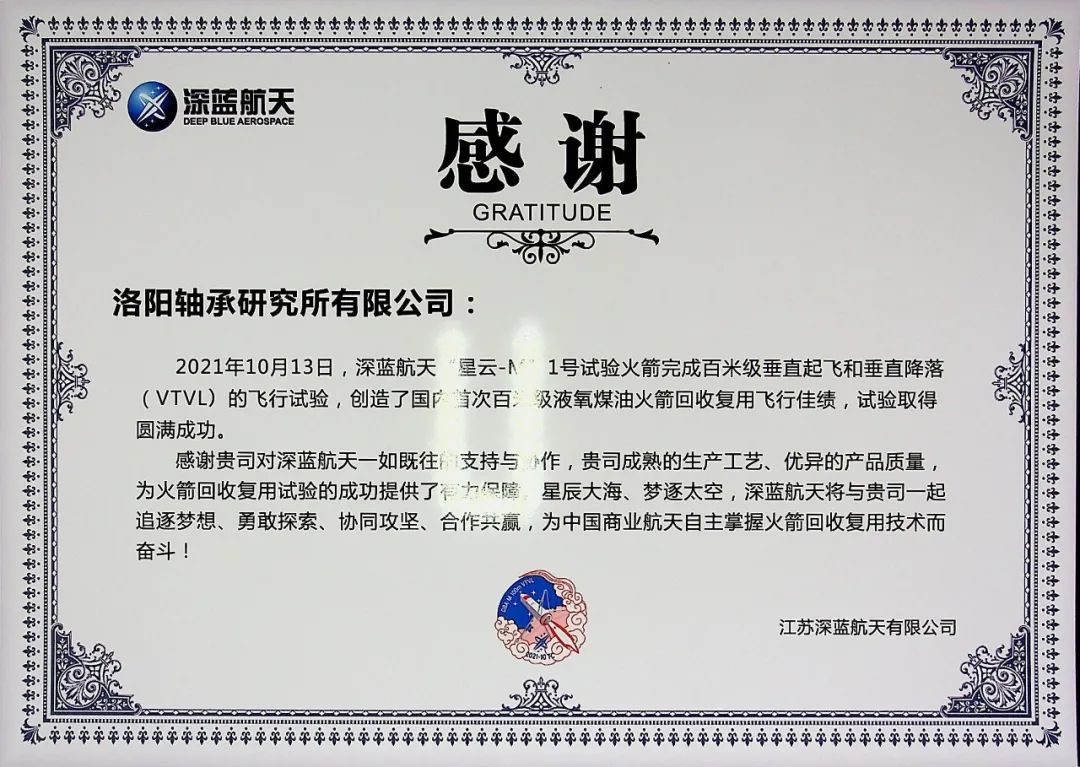 近日,洛陽軸承研究所有限公司(以下簡稱“軸研所”)收到江蘇深藍(lán)航天有限公司(以下簡稱“深藍(lán)航天”)發(fā)來的感謝信,信中深藍(lán)航天對軸研所在“星云-M”1號試驗(yàn)箭成功完成百米級垂直起飛及降落(VTVL)飛行試驗(yàn)中提供的有力配套保障表示衷心感謝。
