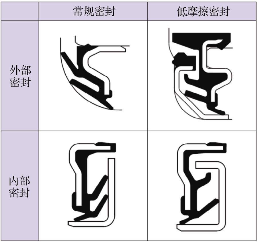 第3代輪轂軸承常規(guī)密封和低摩擦密封采用的外部密封和內(nèi)部密封的結(jié)構(gòu)對(duì)比如圖6所示。