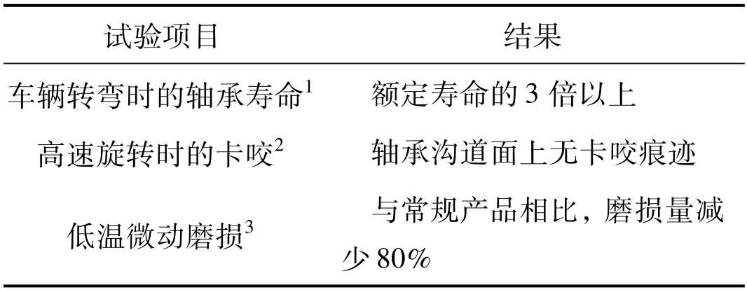 還進(jìn)行了可靠性評(píng)價(jià)試驗(yàn),以驗(yàn)證所需的功能,見(jiàn)表3。填充新潤(rùn)滑脂的軸承滿足了試驗(yàn)項(xiàng)目的所有開(kāi)發(fā)目標(biāo),實(shí)現(xiàn)了軸承內(nèi)部潤(rùn)滑脂所要求的所有功能。