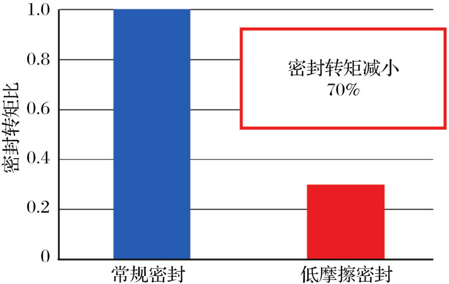 減小摩擦不僅是由于結(jié)構(gòu),還由于具有低摩擦因數(shù)的橡膠材料、唇接觸表面的優(yōu)化設(shè)計(jì)和唇部用脂。與常規(guī)產(chǎn)品相比,這些產(chǎn)品的密封轉(zhuǎn)矩減小了70%,如圖7所示。