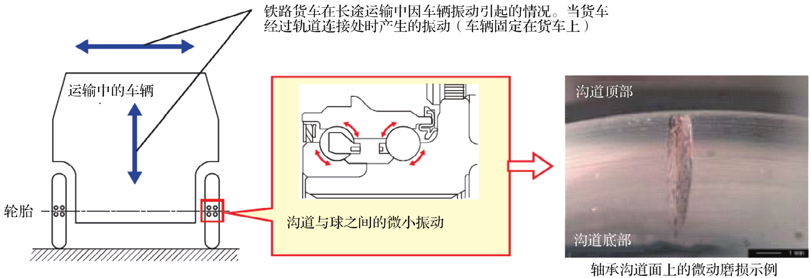 新制造的車(chē)輛在鐵路貨車(chē)上進(jìn)行長(zhǎng)途運(yùn)輸時(shí),輪轂軸承的溝道與球之間會(huì)產(chǎn)生微小振動(dòng)。如圖4中的箭頭所示,振動(dòng)會(huì)擠壓出溝道與球之間的潤(rùn)滑脂,產(chǎn)生金屬與金屬接觸,導(dǎo)致微動(dòng)磨損。在潤(rùn)滑脂趨于變硬和流動(dòng)性降低的低溫條件下,微動(dòng)磨損更明顯。在這種情況下駕駛車(chē)輛可能會(huì)產(chǎn)生異常聲。