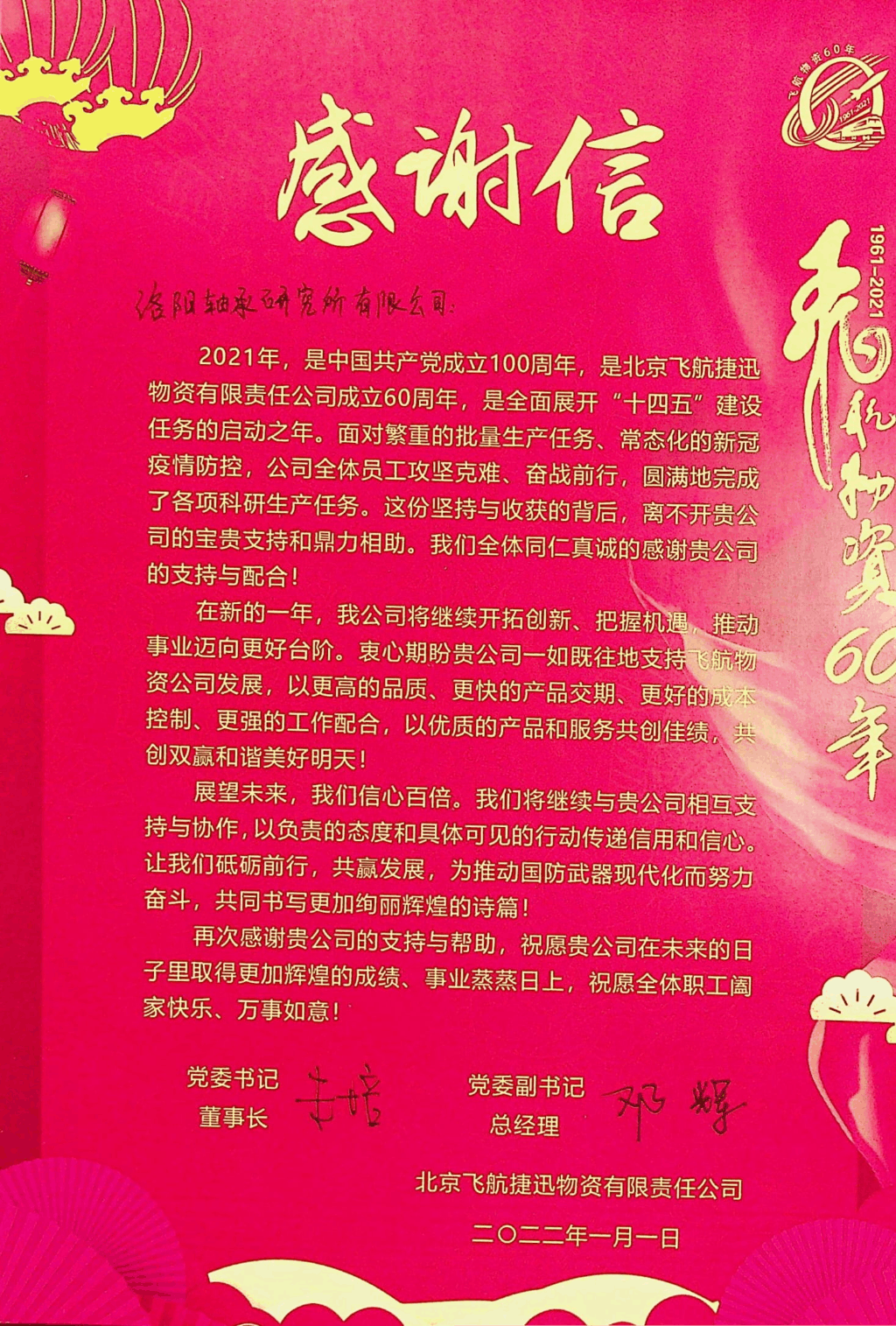 新年伊始,萬象更新。洛陽軸承研究所有限公司(簡稱軸研所)陸續(xù)收到了5封來自航空航天客戶和軍隊工廠的感謝信。信中對軸研所長期以來在軍工科研生產(chǎn)配套任務(wù)和國防武器裝備現(xiàn)代化方面給予的支持和相助表示敬意和衷心的感謝。