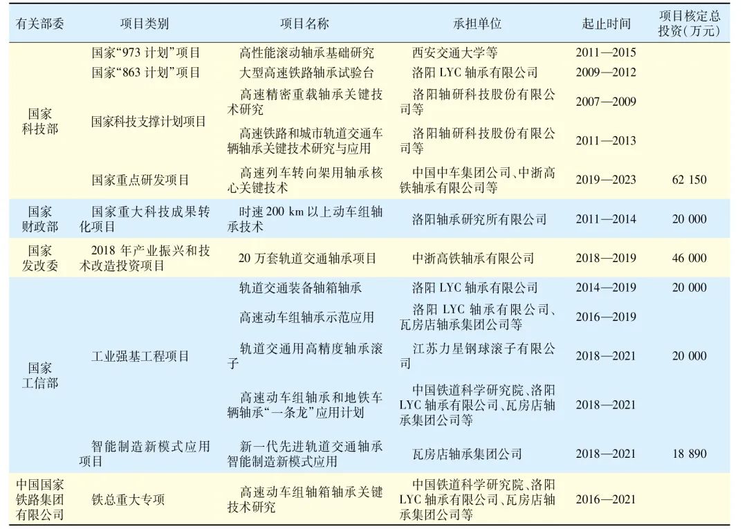 高速鐵路是戰(zhàn)略性新興產(chǎn)業(yè),是制造強國戰(zhàn)略的重點領域。國產(chǎn)高速動車組及配套軸承的開發(fā)應用引起了國家有關部委的高度重視和社會各界的廣泛關注。十多年來,國家有關部委實施了一系列支持國產(chǎn)高速動車組軸承開發(fā)應用的政策項目,見表5(據(jù)不完全統(tǒng)計,這些項目核定總投資近19億元)。