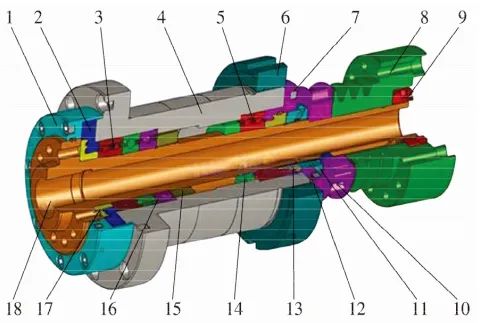 1-護套;2-前壓緊環(huán);3-前軸承;4-軸承座;5-后軸承;6-后鎖緊螺母;7-后端蓋;8-驅動帶輪;9-帶輪鎖緊螺母;10-編碼器帶輪;11-后緊定螺母;12-后壓蓋;13-后壓緊環(huán);14-后調整環(huán);15-前緊定螺母;16-角接觸軸承組;17-前調整環(huán);18-主軸。