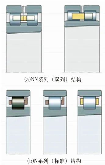 成對組配或多聯組配角接觸球軸承如圖8所示,在應用安裝時必須施加一定的預載荷。選擇適當的預載荷可以提高主軸系統(tǒng)剛性,降低溫升,改善系統(tǒng)加工精度。軸承預載荷通常分為輕(A)、中(B)、重(C)3檔,用戶可根據主軸系統(tǒng)的實際工況進行選擇。單、雙列圓柱滾子軸承的結構如圖9所示。雙向推力角接觸球軸承如圖10所示,通常要求SP等級公差,有需要時也可要求UP等級公差。