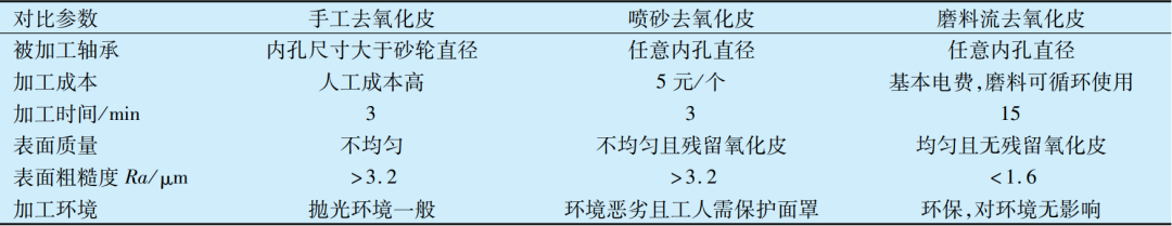 基于上述試驗結果,將磨料流去氧化皮方法與傳統(tǒng)手工和噴砂去氧化皮進行對比,結果見表1,采用磨料流加工方法去除氧化皮的經(jīng)濟性和加工質(zhì)量均明顯優(yōu)于其他2種,且磨料流加工法更環(huán)保,但加工效率略低于其他2種。