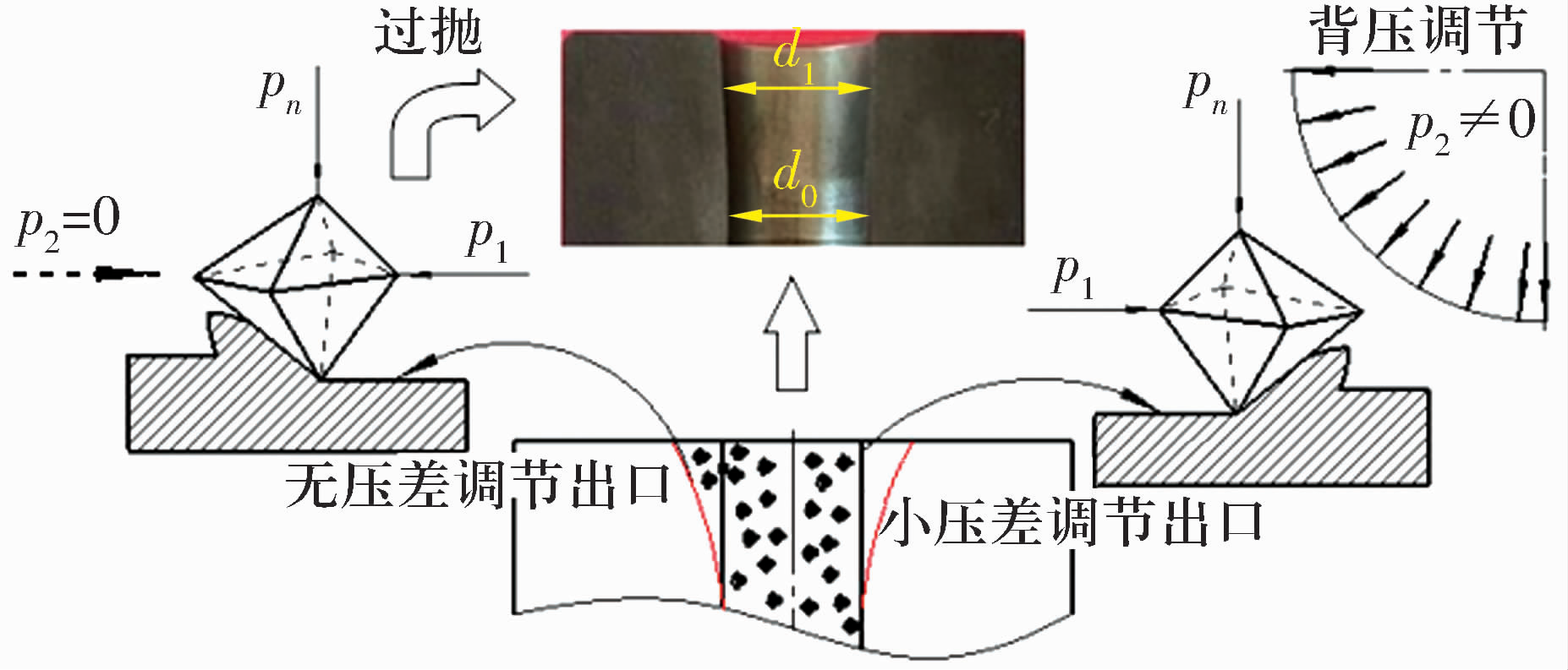 在上述無背壓的“穿膛過”磨粒流加工條件下,將加工后的工件線切割開,可以明顯看出進出口處的尺寸d1,大于中間區(qū)域的尺寸d0,并形成“喇叭口”。出現(xiàn)該結果的主要原因是由于黏彈性磨料在出口處的突然擠入與釋放時形成的擠壓壓力過大,從而在工件兩端出現(xiàn)嚴重的過拋現(xiàn)象,嚴重影響空心滾子的尺寸。為避免“喇叭口”的形成,應該控制進出口的壓差,使磨粒流在加工過程中實現(xiàn)均勻的擠壓運動。因此,在擠壓過程中對磨粒流施加一個回程壓力,即背壓P2與“穿膛過”式(背壓P2為零)的情況相比,在擠壓過程中增加磨料流回程壓力,可以降低壓力在進出口處的突變,實現(xiàn)進出口處壓力的小壓差調(diào)節(jié),從而有效抑制“喇叭口”的形成,其原理如圖6所示。