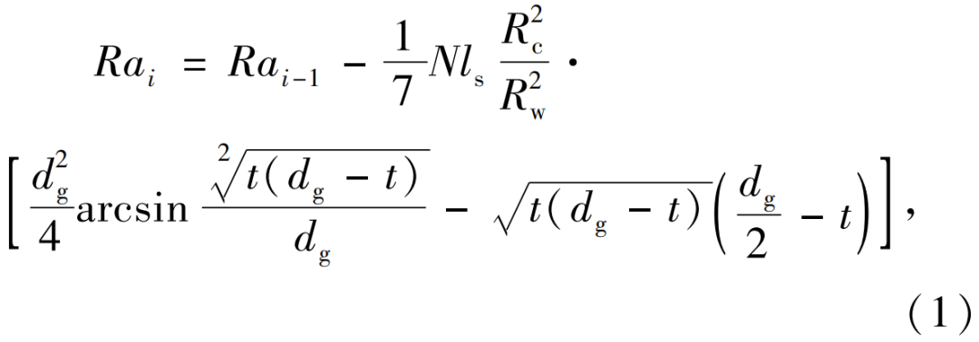 在磨料流加工中,假定工件內(nèi)表面輪廓均勻,初始表面粗糙度為Ra0,并且磨料在壓力作用下沿工件內(nèi)孔的軸線方向往復移動,劃痕方向上的峰谷粗糙度Rt0與算術平均表面粗糙度Ra比值恒定。假定Rai為第i次加工后獲得的內(nèi)孔表面粗糙度,其模型可由(1)式計算,即