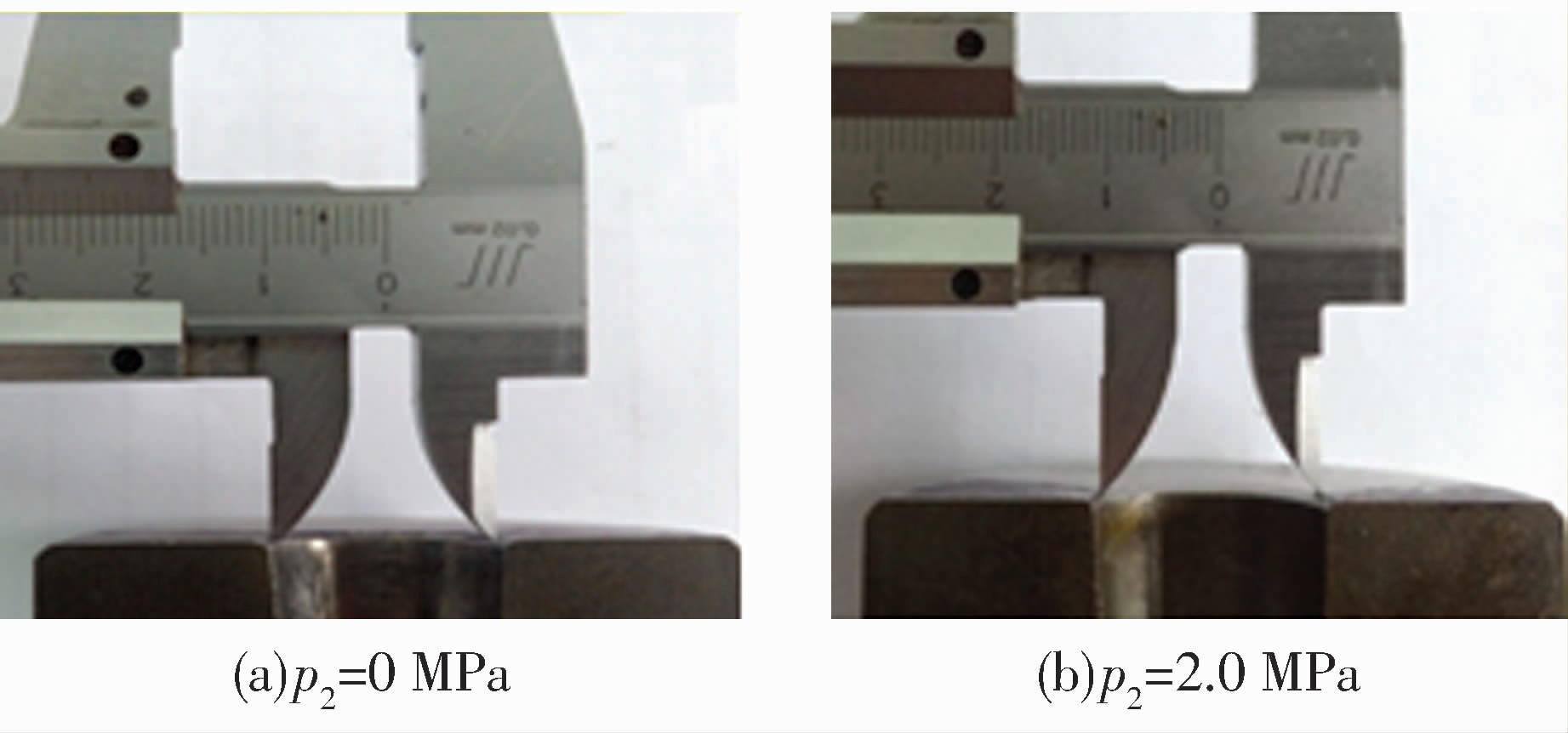 為進一步驗證背壓下磨料流對空心滾子內(nèi)孔進口與出口氧化皮的擠壓去除效果,分別將背壓設定為0,2.0 MPa進行20次循環(huán)的磨料流加工。試驗后測量空心滾子的端口處直徑,結果如圖7所示:采用無背壓“穿膛過”式磨料流加工后的徑口直徑為20.112 mm,而采用2.0 MPa背壓后的徑口直徑為19.120 mm。為確保加工后滾子內(nèi)孔的尺寸,在加工過程對磨料流施加適當?shù)谋硥?,可有效抑制過拋現(xiàn)象。