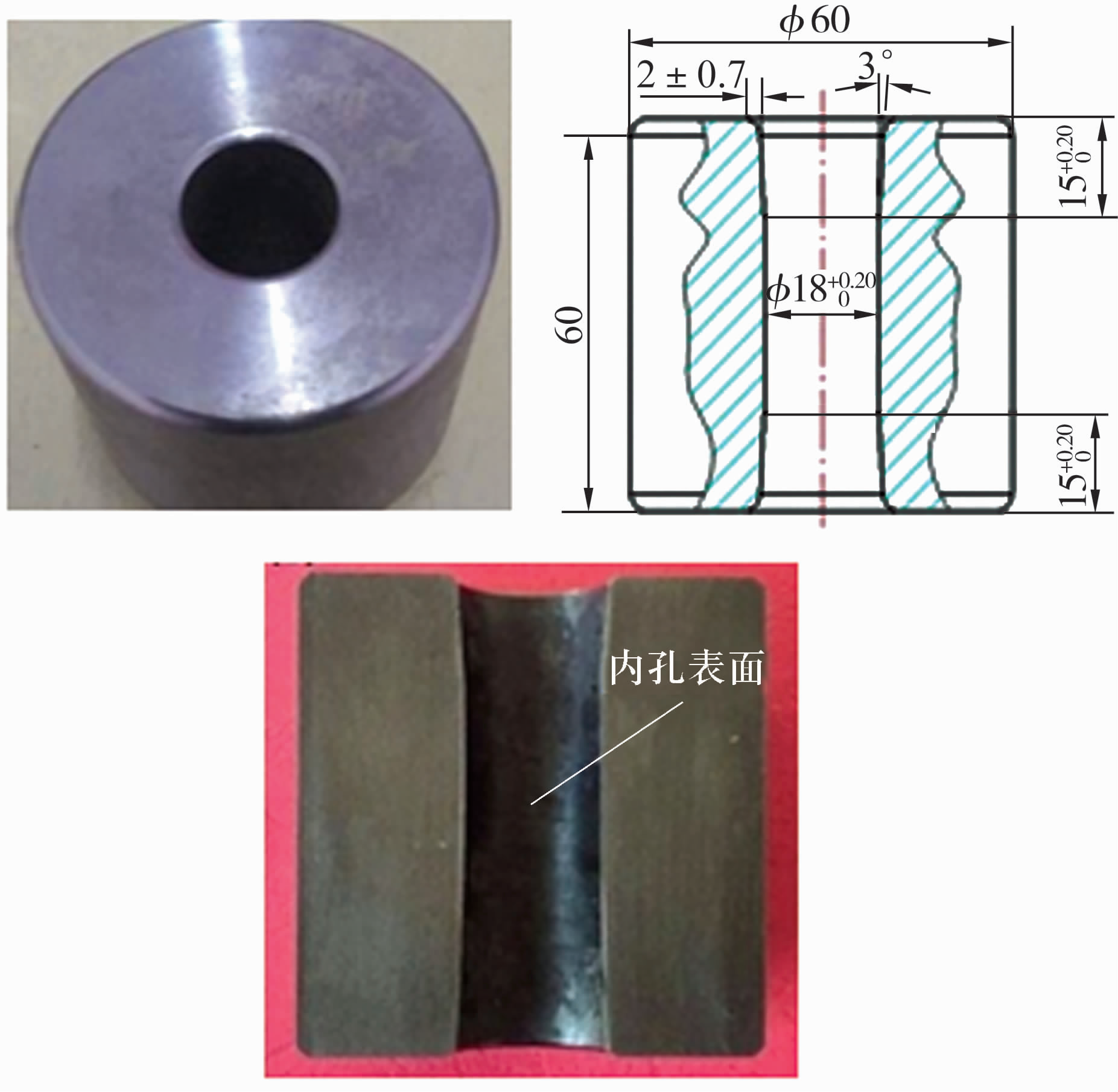 空心滾子試樣材料為GCr15,尺寸為φ60 mm×φ18 mm×60 mm。由于在熱處理過程保護氣氛的作用下,熱處理后可以清晰地看到厚薄不均勻的黑色氧化皮,且去除困難。空心滾子線切割后主要尺寸及內(nèi)孔表面的氧化皮如圖3所示。
