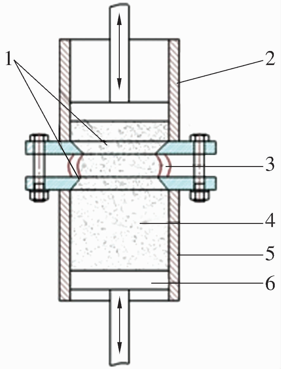 1—夾具;2—上料缸;3—工件;4—黏彈性磨料;5—下料缸;6—擠壓活塞。