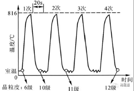 如圖1所示,首先將零件快速加熱到Ac3以上,經(jīng)短時間保溫后迅速冷卻,如此循環(huán)多次。由于每加熱一次,奧氏體晶體就被細(xì)化一次,所以經(jīng)過4次循環(huán)后,便使45鋼的晶粒度從6級細(xì)化到12級。
