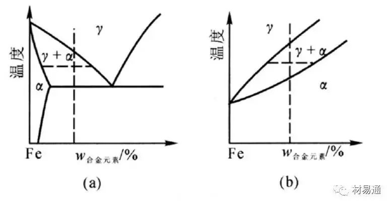 (2)鋼中所含各種元素可分為擴(kuò)大γ區(qū)元素(如碳、錳、鎳、氮等)和縮小γ區(qū)元素(如磷、銻、錫、硅等)兩大類。圖3表示兩類二元鐵基合金的相圖。