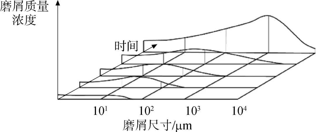 主軸軸承通常都有大流量潤(rùn)滑油循環(huán)使用,當(dāng)出現(xiàn)磨損、疲勞等會(huì)產(chǎn)生顆粒進(jìn)入潤(rùn)滑油。潤(rùn)滑系統(tǒng)中的磨屑質(zhì)量濃度和顆粒尺寸會(huì)隨時(shí)間變化,如圖4所示,根據(jù)潤(rùn)滑系統(tǒng)中的磨屑尺寸、質(zhì)量濃度、形貌、成分可以判斷設(shè)備是否故障及故障位置。