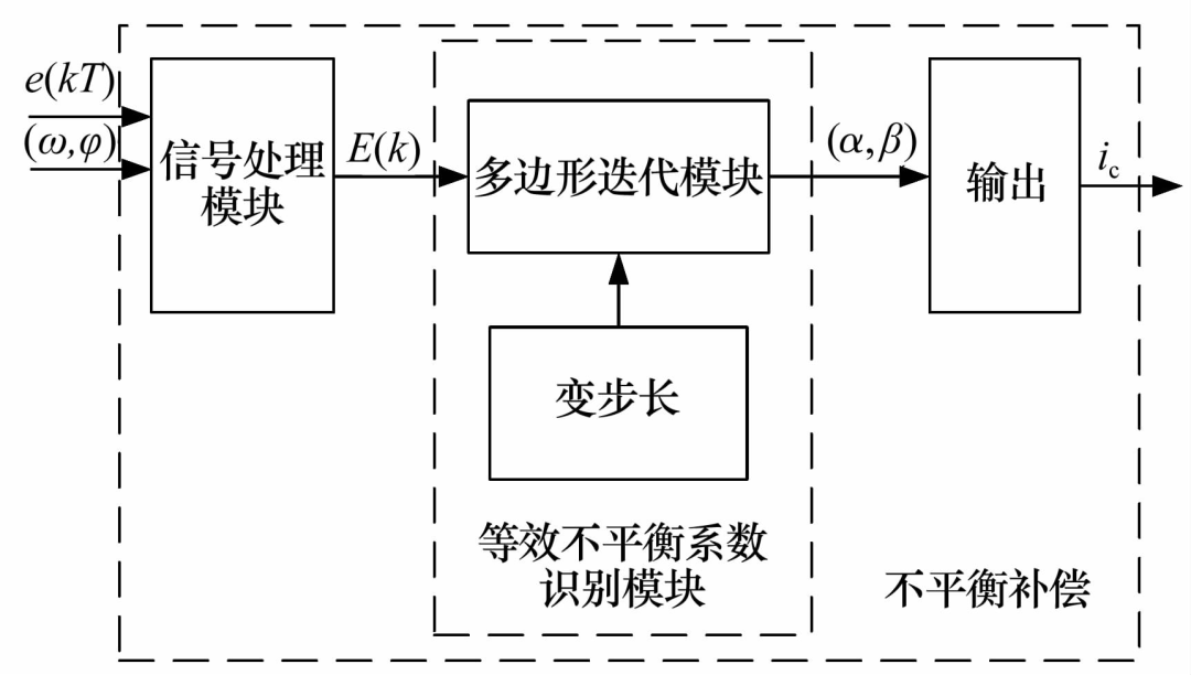 為避免過于依賴模型精確度的問題,通過自適應(yīng)算法得到不平衡幅值估計。文獻[33]提出一種基于擴展影響系數(shù)法的磁軸承轉(zhuǎn)子位移跳動檢測方法,解決了之前補償算法中需要對傳感器進行3點設(shè)置以及補償失效的問題,能夠自適應(yīng)識別并補償轉(zhuǎn)子跳動。文獻[34]對影響系數(shù)法進行優(yōu)化,提出了一種廣義影響系數(shù)法并針對不平衡幅值進行了測試,在每次試加質(zhì)量后判斷是否能夠平衡,通過反復試加以找到最優(yōu)解,在磁懸浮轉(zhuǎn)子高轉(zhuǎn)速工況下能夠得到比傳統(tǒng)影響系數(shù)法更準確的結(jié)果。文獻[35]則提出了一種基于主動磁軸承的影響系數(shù)法,通過主動磁軸承對轉(zhuǎn)子校正面各試加一次與位移同頻同相電流,代替了傳統(tǒng)動平衡的配重與去重,其補償方法如圖11所示,通過計算得到轉(zhuǎn)子不平衡振動補償電流,從而實現(xiàn)轉(zhuǎn)子正常運行中的在線不平衡補償。