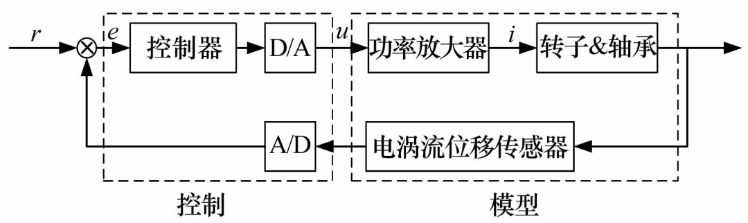 磁懸浮柔性轉(zhuǎn)子系統(tǒng)是典型的機電一體化系統(tǒng),包括控制器、D/A轉(zhuǎn)換模塊、功率放大器、轉(zhuǎn)子、定子、電渦流位移傳感器和A/D轉(zhuǎn)換模塊,典型的磁懸浮轉(zhuǎn)子系統(tǒng)結(jié)構(gòu)如圖1所示。磁懸浮轉(zhuǎn)子的閉環(huán)控制系統(tǒng)原理如圖2所示:電渦流位移傳感器檢測轉(zhuǎn)子相對于參考位置r的偏移e,經(jīng)A/D轉(zhuǎn)換后作為數(shù)字量輸入到控制器,控制器經(jīng)過相應(yīng)的控制算法運算輸出控制信號u,經(jīng) D/A轉(zhuǎn)換后輸入到功率放大器,功率放大器產(chǎn)生控制電流i并使轉(zhuǎn)子穩(wěn)定在平衡位置。