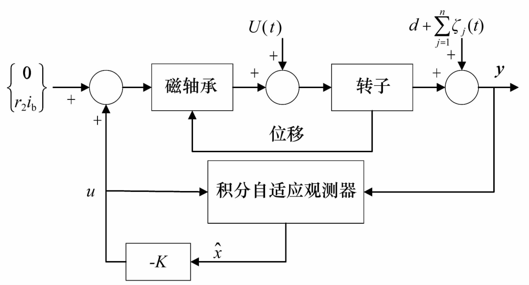 另外,文獻[26]提出了一種基于頻域自適應(yīng)LMS算法的諧波振動抑制方法,對每個權(quán)值設(shè)置相應(yīng)的步長并實時調(diào)整,在保證穩(wěn)態(tài)精度的同時提高了收斂速度。文獻[27]提出了一種新的積分自適應(yīng)觀測器(圖9),用于識別傳感器誤差的直流和諧波含量并同時估計系統(tǒng)狀態(tài),試驗表明當系統(tǒng)同時受到測量誤差和不平衡干擾時能有效減小位移和電流幅值。文獻[28]提出了一種針對低次主導諧波的通用選擇分數(shù)階重復控制方法,實現(xiàn)了任意轉(zhuǎn)速下快速高精度的諧波電流抑制。