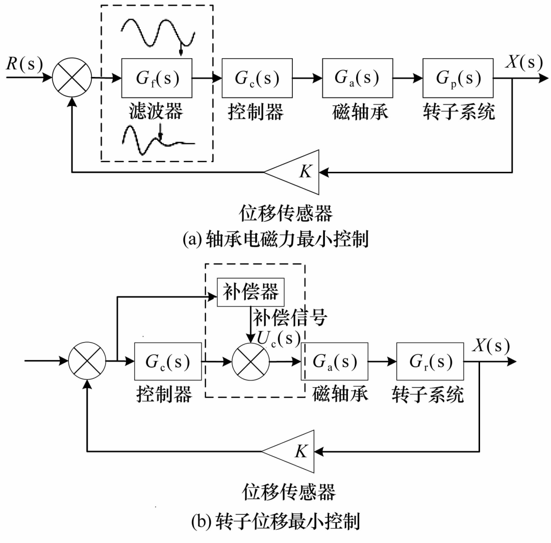 目前,磁懸浮轉(zhuǎn)子不平衡振動控制策略有軸承電磁力最小控制和轉(zhuǎn)子位移最小控制這2種。