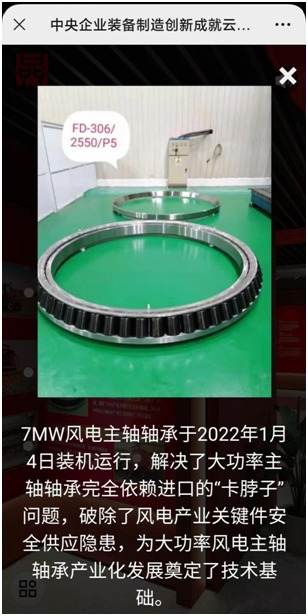 軸研所研制的7 MW風(fēng)電主軸軸承作為國機(jī)集團(tuán)展區(qū)的主要展覽項(xiàng)目,吸引了廣大線上參觀者的目光。7 MW級(jí)海上風(fēng)電主軸承作為風(fēng)力發(fā)電機(jī)的核心零部件,載荷復(fù)雜多變,軸承可靠性及精度要求高,且設(shè)計(jì)壽命需達(dá)到25年以上,技術(shù)難度大,長期被國外軸承企業(yè)壟斷。公司通過多次試驗(yàn),不斷攻關(guān),相繼攻克軸承材料優(yōu)選、熱處理工藝改善、保持架優(yōu)化設(shè)計(jì)與加工等方面技術(shù)難題,成功研制7 MW大功率風(fēng)電主軸軸承,并于2022年1月4日裝機(jī)運(yùn)行,解決了大功率主軸軸承完全依賴進(jìn)口的“卡脖子”問題。