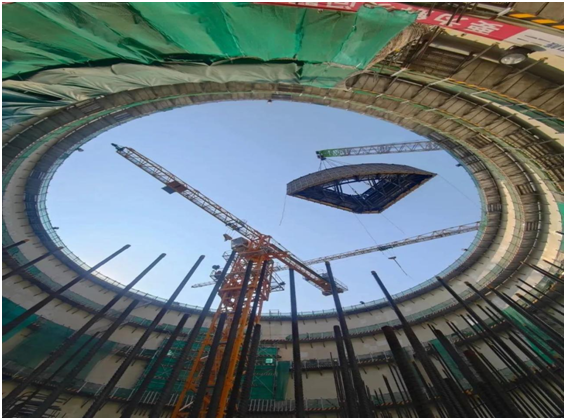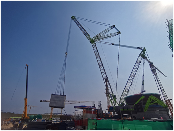 海南昌江“華龍一號(hào)”3號(hào)機(jī)組非能動(dòng)注水箱模塊一的吊裝總重量約為122噸,在歷時(shí)2小時(shí)的起升、帶載行走、回轉(zhuǎn)、變幅、落鉤等作業(yè)后,設(shè)備精準(zhǔn)就位,吊裝過(guò)程中,起重機(jī)運(yùn)行平穩(wěn)正常、安全、可控。此次吊裝采用中聯(lián)重科2000噸履帶式起重機(jī),其專用的六排滾子回轉(zhuǎn)支承由公司自主研發(fā)、生產(chǎn)制造。