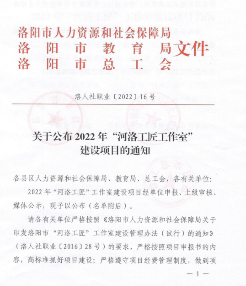 近日,洛陽市人社局發(fā)布《關(guān)于公布2022年“河洛工匠工作室”建設(shè)項目的通知》(洛人社職業(yè)〔2022〕16號),公司籌建的張同賀“河洛工匠”工作室在獲批的5家單位中名列第二,獲得項目建設(shè)配套支持資金十萬元。