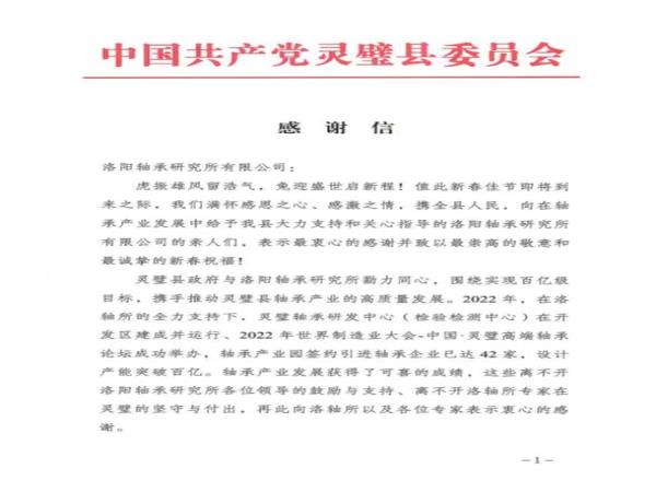近日,公司收到靈璧縣委、縣政府的感謝信,信中充分肯定了公司對(duì)建設(shè)靈璧軸承研發(fā)中心所作出的重要貢獻(xiàn),對(duì)公司表達(dá)了敬意和感謝,并希望與公司持續(xù)開(kāi)展深層次合作。