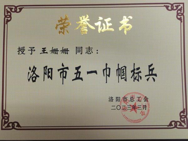 3月6日,洛陽市總工會表彰了“2022年度洛陽市巾幗獎先進集體和先進個人”,公司制造服務事業(yè)部王姍姍被授予“洛陽市五一巾幗標兵”榮譽稱號。